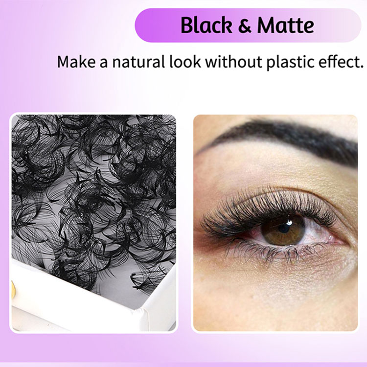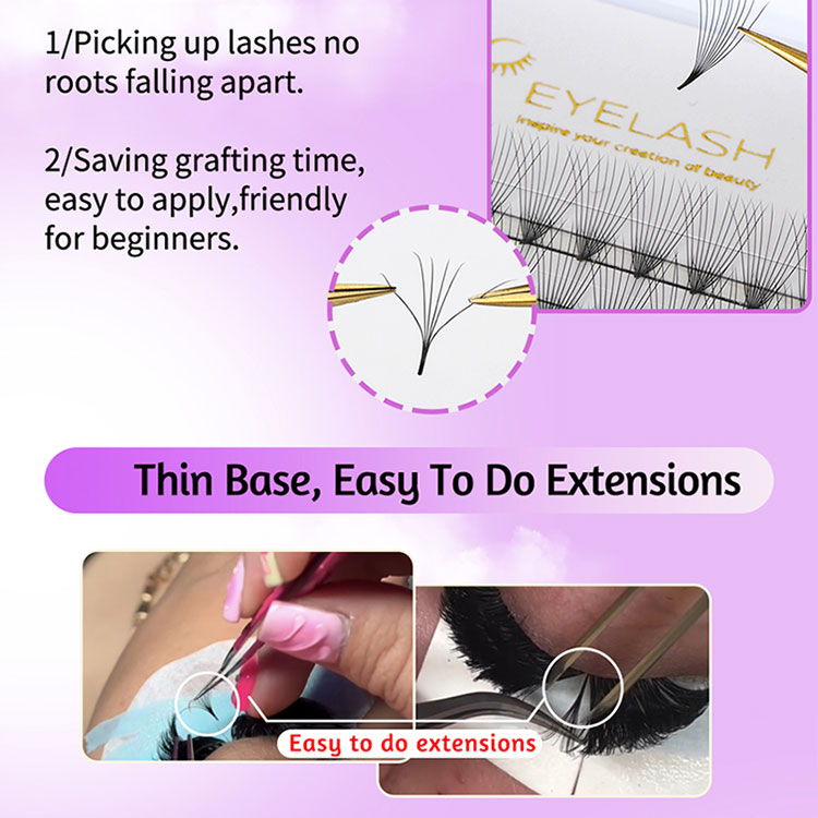 మా ముందే తయారుచేసిన క్లస్టర్డ్ తప్పుడు వెంట్రుకలు ఖచ్చితమైన హాట్ మెల్ట్ టెక్నాలజీ ద్వారా రూపొందించబడ్డాయి, ఇందులో స్లిమ్ కోణాల బేస్ డిజైన్ను కలిగి ఉంటుంది, ఇది ధృ dy నిర్మాణంగల మరియు సులభంగా వదులుగా ఉండదు. ఈ తప్పుడు వెంట్రుక పొడిగింపులు సహజ వెంట్రుకలతో సజావుగా కలపగలవు. మీరు తప్పుడు వెంట్రుక జిగురును ఎక్కువగా ఉపయోగించాల్సిన అవసరం లేదు, అంటే సహజ వెంట్రుకలపై తక్కువ భారం మరియు వారి ఆరోగ్యం మరియు అందాన్ని కొనసాగిస్తుంది.