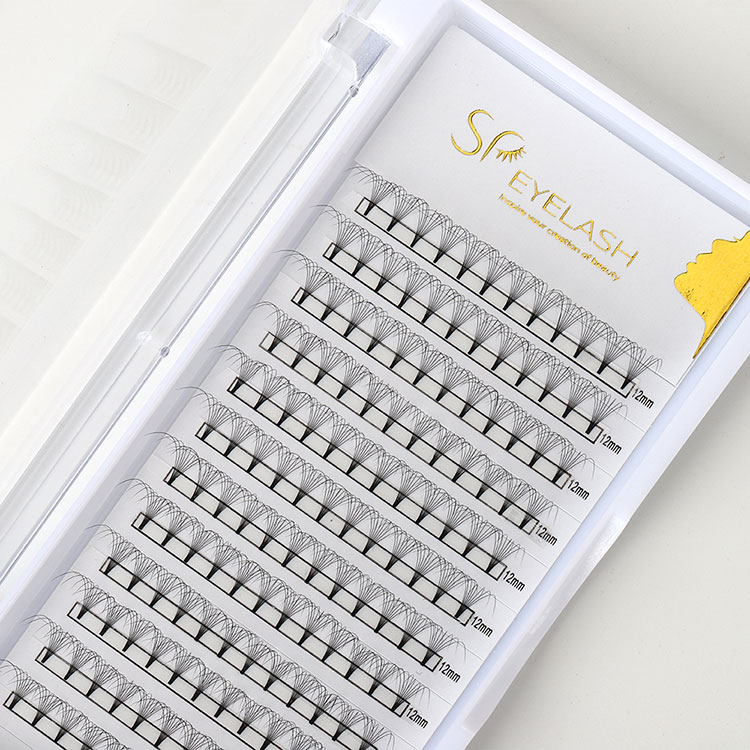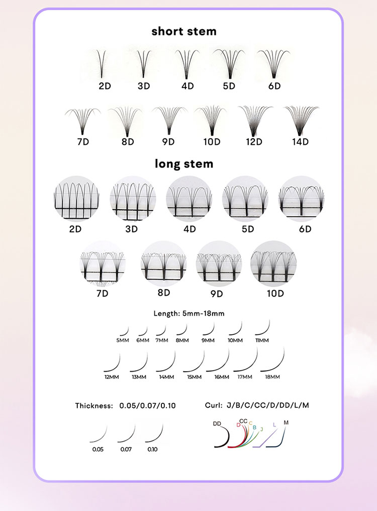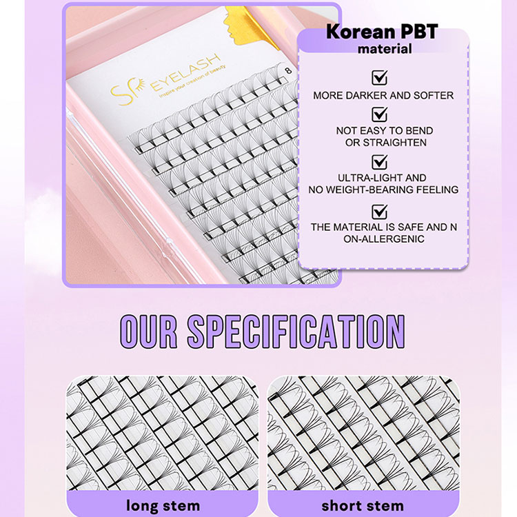 ప్రీమేడ్ అభిమానులు 8 డి షార్ట్ స్టెమ్ కొరడా దెబ్బలు 100% కొరియన్ పిబిటి మెటీరియల్ నుండి తయారవుతాయి, ఇవి మృదువైనవి, ముదురు రంగులో ఉంటాయి మరియు సన్నని చిట్కాలతో విస్తృత అభిమానులను కలిగి ఉంటాయి. ఈ ఉన్నతమైన పదార్థం సహజ కొరడా దెబ్బలను అనుకరిస్తుంది, ఖాతాదారులకు విలాసవంతమైన మరియు సౌకర్యవంతమైన దుస్తులు అనుభవాన్ని అందిస్తుంది, ఇది వారి అందాన్ని అసౌకర్యం లేకుండా పెంచుతుంది.