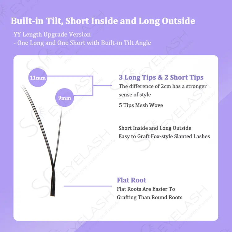 ఎస్పీ ఐలాష్ స్లాంట్ ఫ్లయింగ్ యై ఐలాష్ యొక్క వినూత్న ఫాక్స్ ఐ డిజైన్ 5-పాయింట్ మెష్ నేత సాంకేతిక పరిజ్ఞానాన్ని ఉపయోగిస్తుంది, సహజంగా 3 పొడవైన మరియు 2 చిన్న వెంట్రుకల పంపిణీ ద్వారా కంటి తోకను పొడిగిస్తుంది. . ప్రత్యేకమైన సిల్వర్ రేకు బేస్ డిజైన్ జుట్టు తొలగింపును మరింత సౌకర్యవంతంగా చేస్తుంది, మరియు మ్యాచింగ్ కార్డ్ పారామితులను స్పష్టంగా సూచిస్తుంది, ఇది వెంట్రుక సాంకేతిక నిపుణుల కార్యకలాపాల సామర్థ్యాన్ని బాగా మెరుగుపరుస్తుంది.