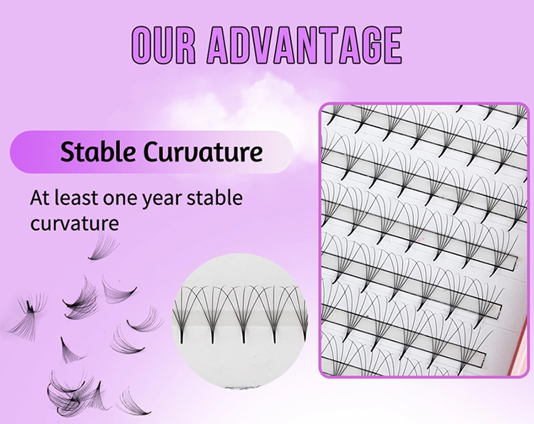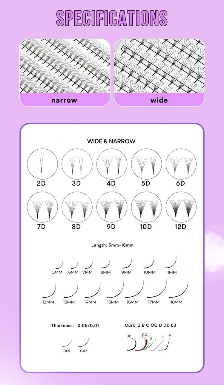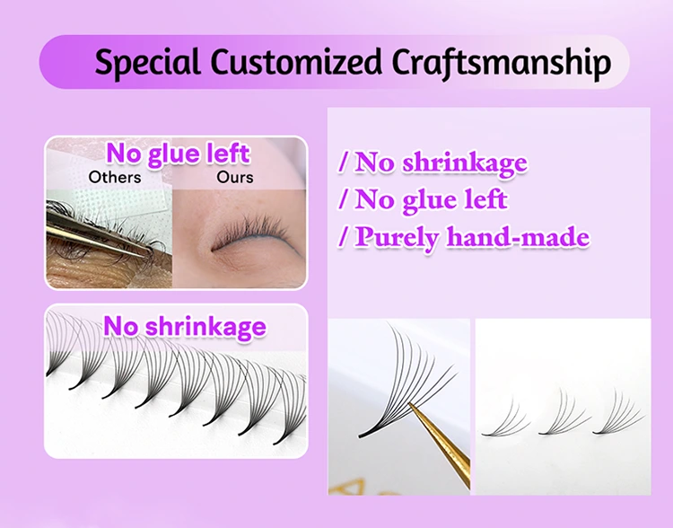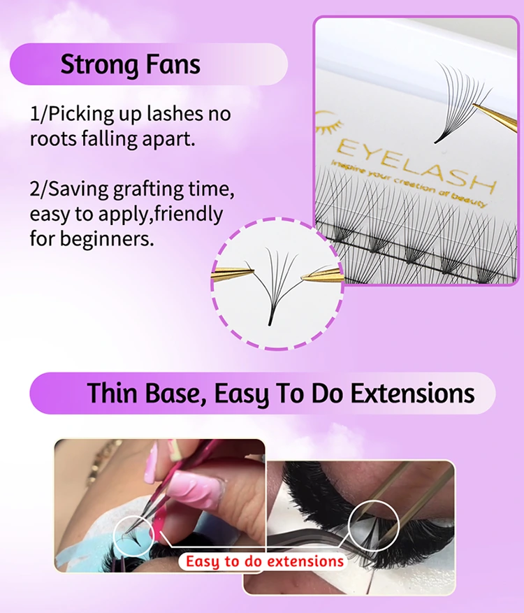అప్లికేషన్ సౌలభ్యం: అల్ట్రా తేలికపాటి స్థావరాలతో ఈ ముందుగా తయారు చేసిన అభిమానులు వాటిని వర్తింపజేయడం చాలా సులభం, ప్రారంభకులు కూడా సులభంగా ప్రారంభించవచ్చు. అంటుకునే కనీస మొత్తం కారణంగా, అవి గరిష్ట నిలుపుదల సమయం మరియు సహజ వెంట్రుకల యొక్క అతుకులు కవరేజీని ఎటువంటి ఖాళీలు లేకుండా చూస్తాయి. తేలికపాటి రూపకల్పన కస్టమర్ సౌకర్యాన్ని నిర్ధారిస్తుంది, అయితే ఫాస్ట్ అప్లికేషన్ ప్రాసెస్ వెంట్రుక కళాకారులను రికార్డు సమయంలో మొత్తం తప్పుడు వెంట్రుకలను పూర్తి చేయడానికి అనుమతిస్తుంది. మీరు అనుభవజ్ఞుడైన ప్రొఫెషనల్ అయినా లేదా అనుభవశూన్యుడు అయినా, ఈ ముందుగా నిర్మించిన అభిమానులు మీ వర్క్ఫ్లో సరళీకృతం చేస్తారు మరియు ఉత్పాదకతను పెంచుతారు.